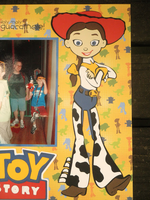 I'm very slowly working my way through the millions of pictures I took last year on our Disney trip. Toy Story Mania was one of our favorite rides-we ALL loved it! I saw the Rootin' Tootin' Shootin' title on a tshirt in the gift shop later and knew that would work it's way onto a layout somehow. This took me a whole evening to make-those cuts on Toy Story are not for the faint-hearted! I cut Jessie at 10 inches and I would not cut her any smaller, as I still had to dig out the tweezers for small pieces. I cut Bullseye at 6 inches (he wasn't as bad as Jessie). The army men weren't too bad either. I love how my layout turned out in the end, even if assembly was a bit tedious :)