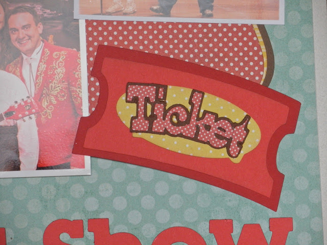 Last summer while on vacation, we went to see a country music show in Branson with the grandparents and an aunt and uncle. Although we are not really country music fans, the show was fantastic and the kids loved it-this was the first big live music show they've seen! The guitar and ticket cuts are from the County Fair cartridge. I LOVE the ticket! The tag tucked behind a picture for journaling is from Plaintain Schoolbook (and I also tucked in one of our admission tickets). The background shapes are from Accent Essentials. The title font is from Birthday Bash.
